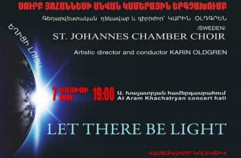 Արամ Խաչատրյան» համերգասրահում մայիսի 7-ին տեղի կունենա Շվեդիայից ժամանած Սուրբ Յոհաննեսի անվան կամերային երգչախմբի (գեղարվետական ղեկավար և դիրիժոր` Կարին Օլդգրին), Հայաստանի պարարվեստի «Բարեկամություն» պետական համույթի (գեղարվեստական ղեկավար՝ ՀՀ ժողովրդական արտիստ Նորայր Մեհրաբյան), և «Սպեղանի» երգչախմբի համատեղ համերգը` «Եղիցի լույս» խորագրով: Համերգի կազմակերպմանն աջակցել է Հ այաստանում Շվեդիայի թագավորության դեսպանությունը՝ ի դեմս դեսպանատան ներկայացուցիչ Մարթեն Էնբերգի։