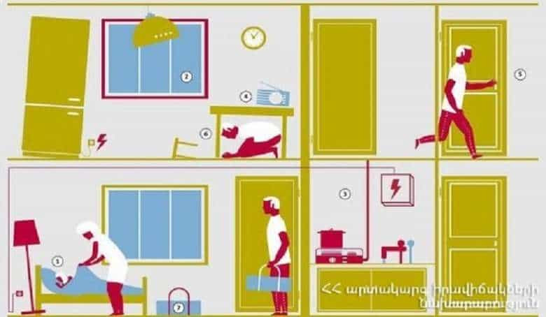 ե․ զգուշացեք ծանր ու մեծածավալ առարկաներից՝ պահարաններից‚ սառնարաններից‚ որոնք կարող են տեղաշարժվել և շրջվել.