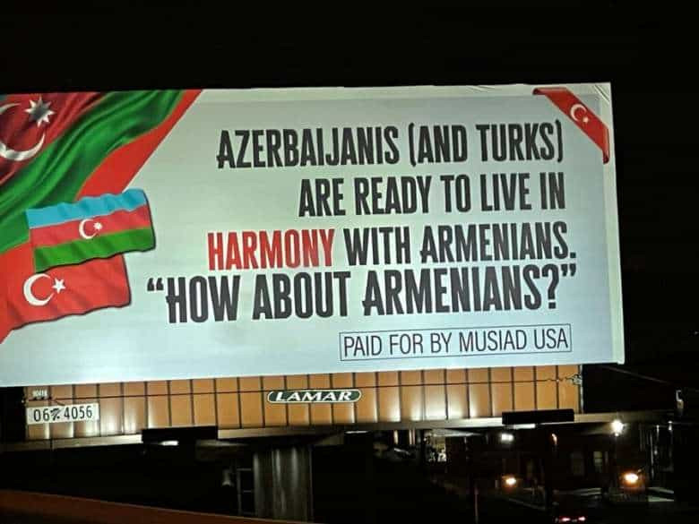 Twitter-ի հայազգի օգտատերերը հայտնում են, որ Փենսիլվանիա նահանգի Ֆիլադելֆիա քաղաքում մեծ վահանակ է տեղադրվել, որի վրա գրված է. «Ադրբեջանցիները (և թուրքերը) պատրաստ են հայերի հետ ապրել ներդաշնակության մեջ: Իսկ պատրա՞ստ են արդյոք հայերը»: