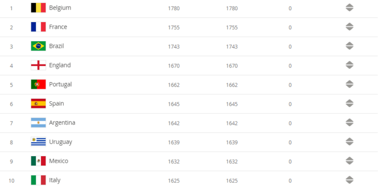 Առաջատարը դարձյալ Բելգիայի հավաքականն է, հաջորդում են Ֆրանսիան, Բրազիլիան, Անգլիան, Պորտուգալիան: