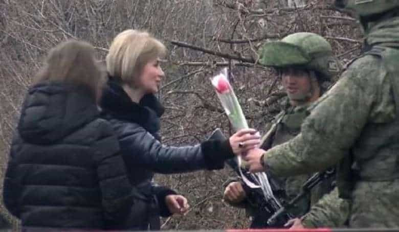 Ռուս զինծառայողները ծաղիկներ են նվիրել Լաչինի միջանցքով անցնող Արցախի բնակչուհիներին