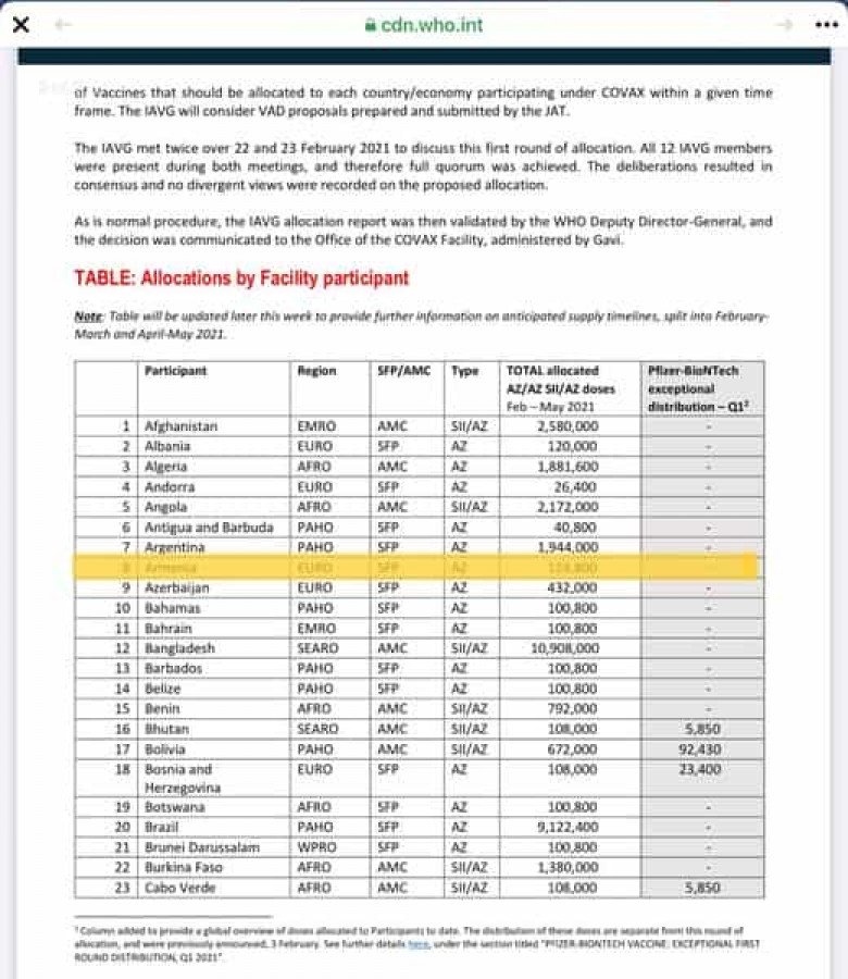 Կորոնավիրուսի տարածման «կոճակը» կրկին սեղմել են, որովհետև մինչև մայիս Covax facility-ի կողմից ստանալու են AstraZeneca ընկերության արտադրած և բազմաթիվ երկրներում արդեն մերժված պատվաստանյութի 124.800 դեղաչափ: Իսկ դիմակ չկրելու համար նախատեսված տուգանքները զուտ ուշադրություն շեղելու համար են... ինչքան փող էլ կպավ՝ կպավ...