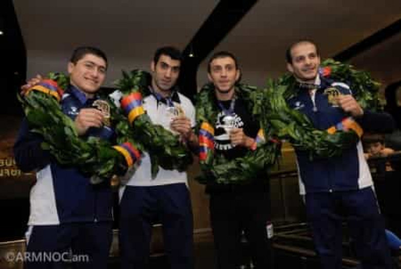 Բեռն-Մոսկվա-Երևան չվերթով Հայաստան վերադարձան Եվրոպայի առաջնության չեմպիոն Հարություն Մերդինյանը, փոխչեմպիոններ Արթուր Դավթյանը, Վահագն Դավթյանը և Արթուր Ավետիսյանը, ինչպես նաև թիմի մյուս անդամները և մարզիչները` գլխավոր մարզիչ Հակոբ Սերոբյանի գլխավորությամբ: Այս մասին տեղեկացրինՀԱՕԿ լրատվության բաժնից: