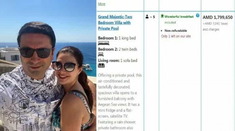 Ալեն Սիմոնյանը ու կինը հանգստացել են Myconian Utopia Resort Mykonos հյուրանոցում, որտեղ մեկ գիշեր մնալու արժեքը, ըստ Booking-ի, հասնում է 1.799.650 դրամի: