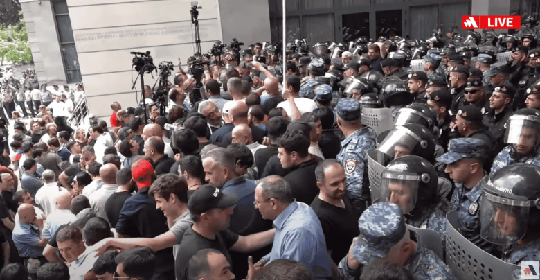 Участники движения «Тавуш во имя Родины» во главе с архиепископом Багратом Србазаном проводят митинг у здания ведомства, требуя у сотрудников выйти к протестующим, на что им было предоставлено полчаса