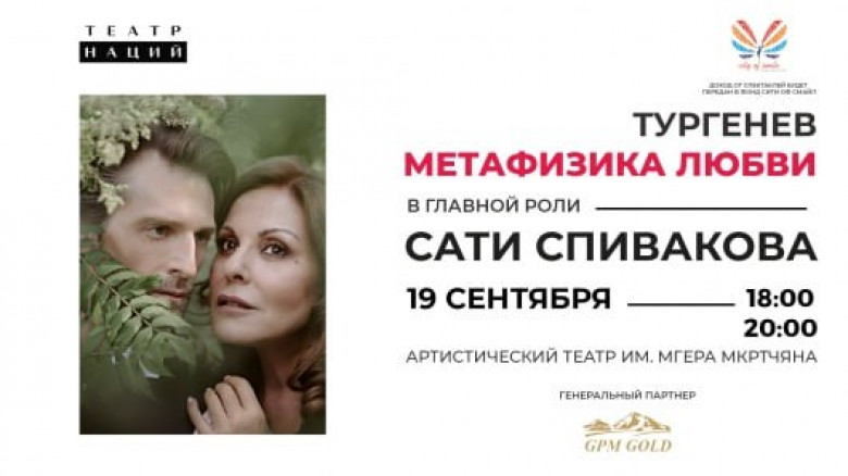 19 сентября на сцене Артистического театра им. Мгера Мкртчяна состоится показ двух спектаклей «Тургенев. Метафизика любви» Московского Театра Наций (режиссер Д. Сердюков). Это изысканная литературно-музыкальная композиция, основанная на переписке Ивана Тургенева и Полины Виардо, в сопровождении музыки Шопена, Сати, Шварца и Десятникова. В главных ролях – Сати Спивакова и Владимир Кошевой. Весь сбор от показов будет направлен в фонд «City of Smile».