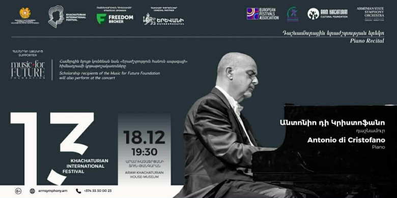 ՄՇԱԿՈՒՅԹ18 декабря в рамках XIII Международного фестиваля Арама Хачатуряна в Доме-музее Арама Хачатуряна при поддержке фонда «Музыка во имя будущего» состоится сольный концерт итальянского пианиста Антонио ди Кристофано. В концерте также примут участие стипендиаты фонда «Музыка во имя будущего». В программе вечера: «Арабеска до мажор, соч. 18» Роберта Шумана (6 минут), «4 баллады, соч. 10» Иоганнеса Брамса (22 минуты), «Долина Обермана» № 6 ля минор из сюиты «Годы странствий» Ференца Листа, S. 160 (14 минут), Соната для фортепиано, соч. 1 Альбана Берга (10 минут), Полонез № 7 ля-бемоль мажор, соч. 61, «Полонез-фантазия» Фредерика Шопена (14 минут).