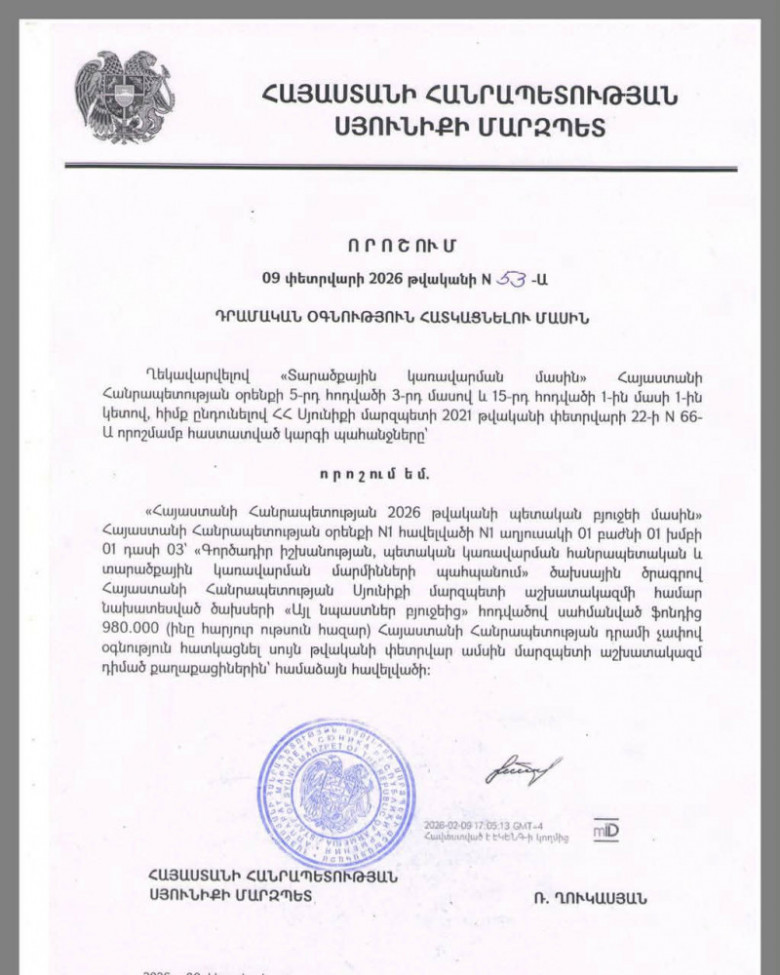 Губернатор Сюника раздал финансовую помощь жителям 9 февраля, всего через два дня после вступления указа в силу, губернатор Сюника подписал решение о предоставлении финансовой помощи жителям области. Согласно Уголовному кодексу, за преступление в виде подкупа избирателей, может грозить до 10 лет тюремного заключения. На данный момент правоохранительные органы еще не приняли официального решения о возбуждении уголовного дела по данному факту.