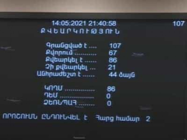 Национальное Собрание Армении в ходе внеочередного заседания 14 мая 86 голосами «за» приняло проект заявления парламента о кризисной ситуации в приграничных районах республики, инициированный партией «Процветающая Армения».