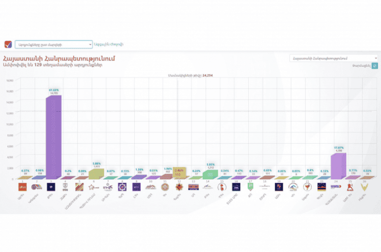 Партия «Гражданский договор» получила 53,92% (687251 голос), блок «Армения» – 21,04% (268165), блок «Честь имею» – 5,23% (66633), «Процветающая Армения» – 3,96% (50416).